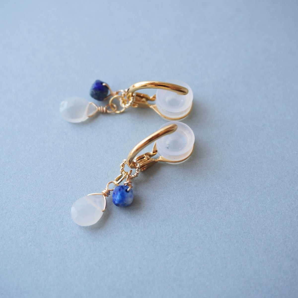 ラピスラズリは、深い青色が豊かな想像力を刺激するとされる天然石で、持つ者に自信を与えると言われています。また、ホワイトムーンストーンは、月の光のような神秘的な輝きを放ち、耳元をさりげなく上品に仕上げる魅力があります。
