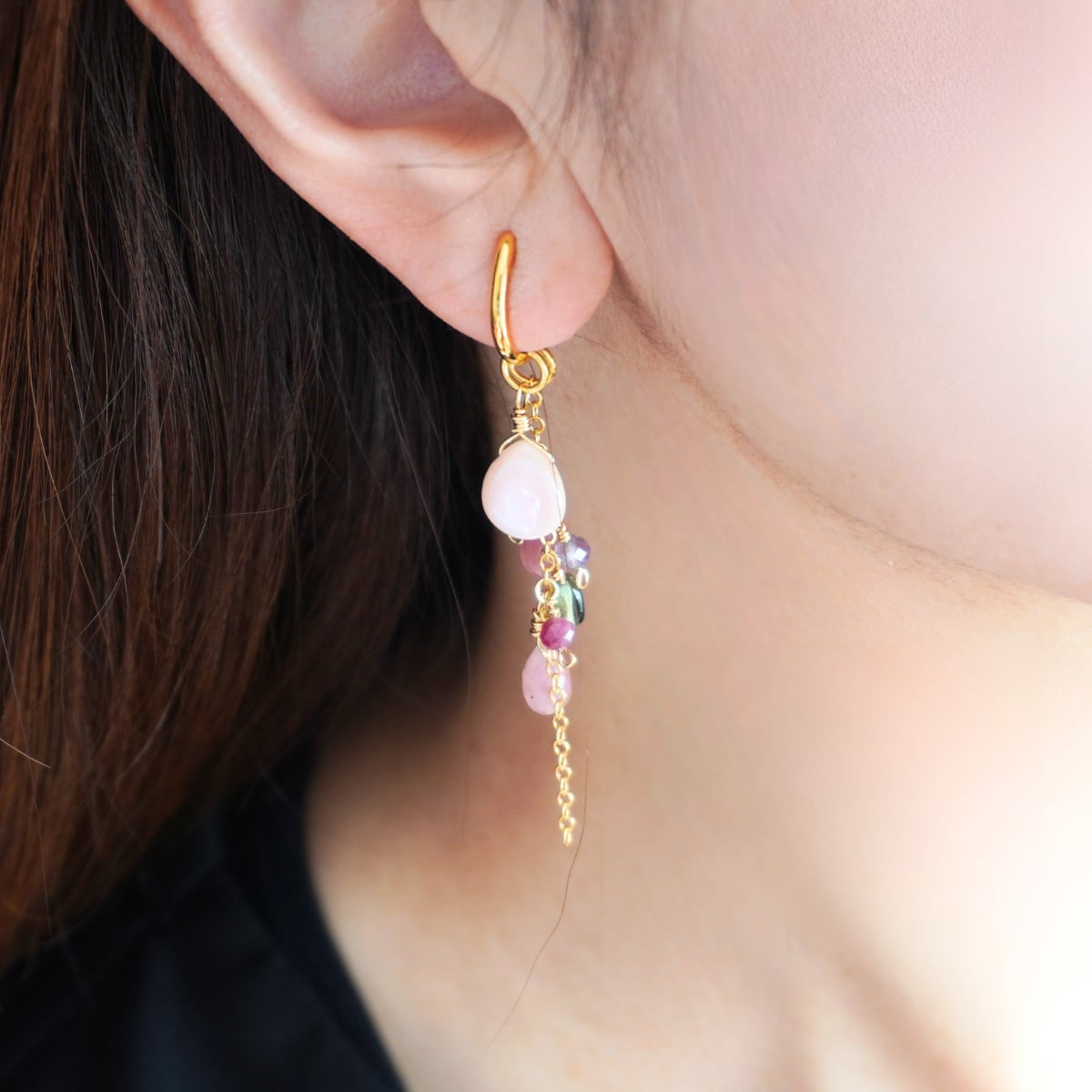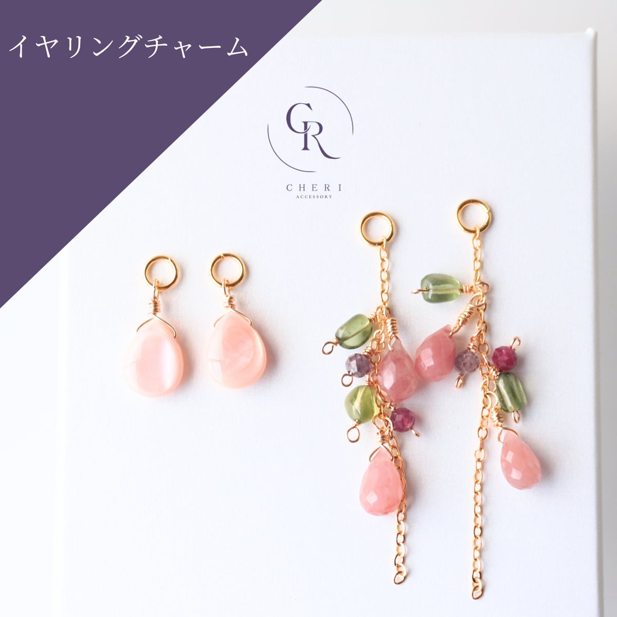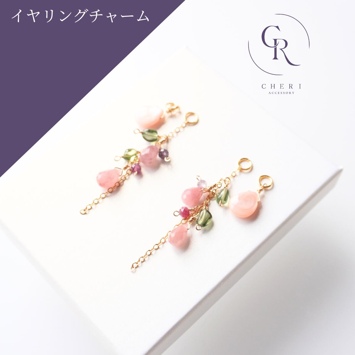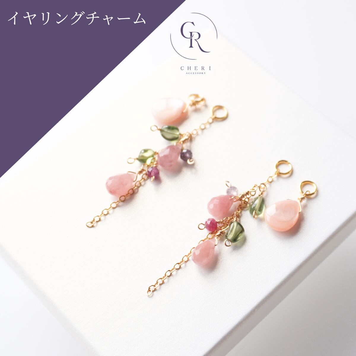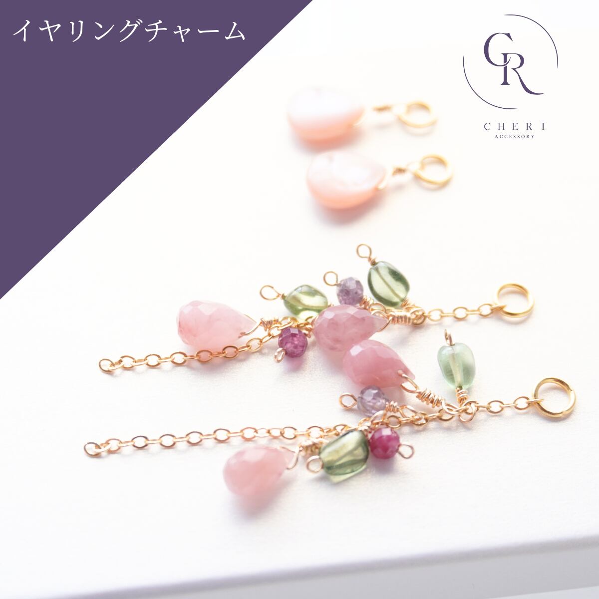 イヤリングチャーム 4way 着せ替え 天然石 ピンクシェル ストロベリークォーツ グリーントルマリン ガーネット 春