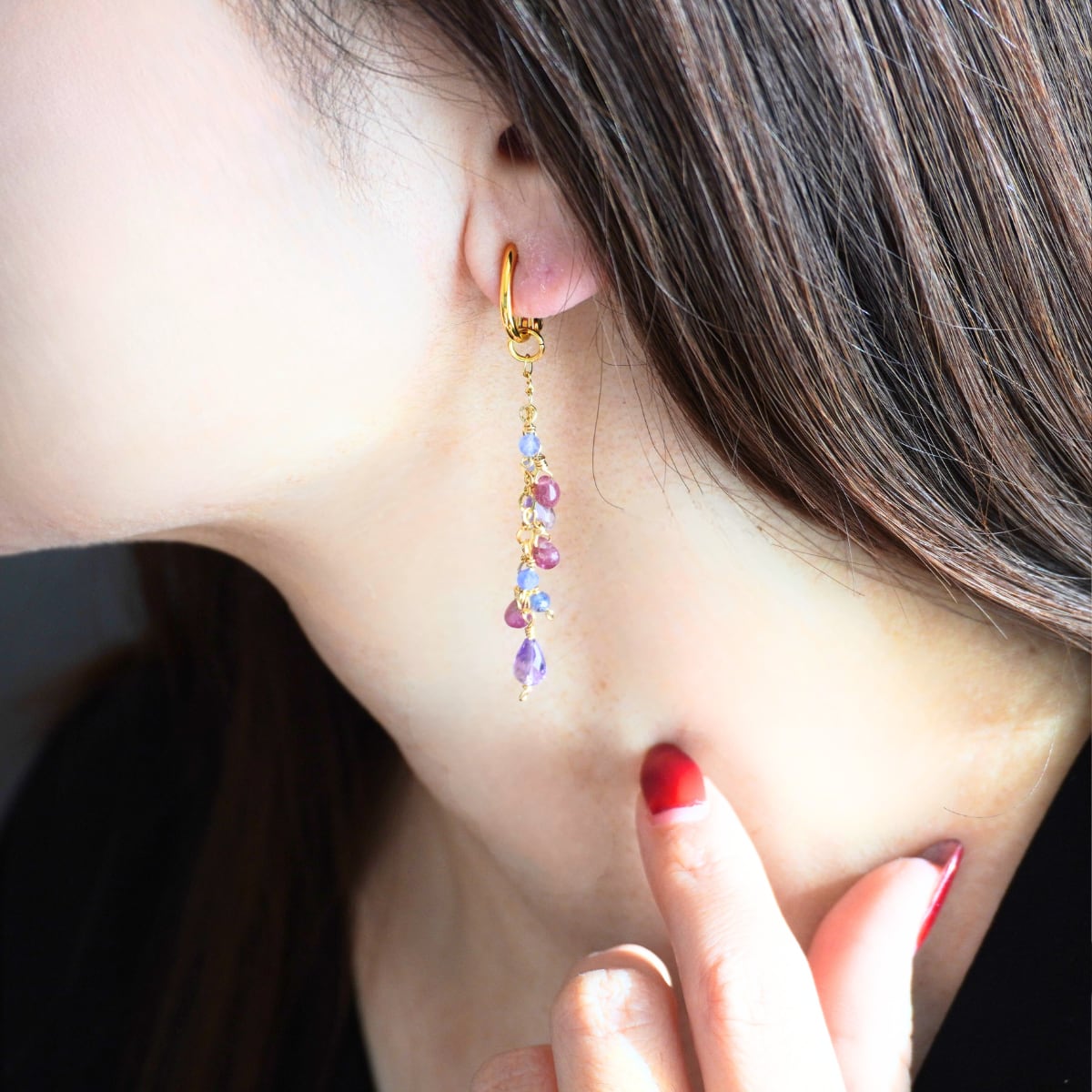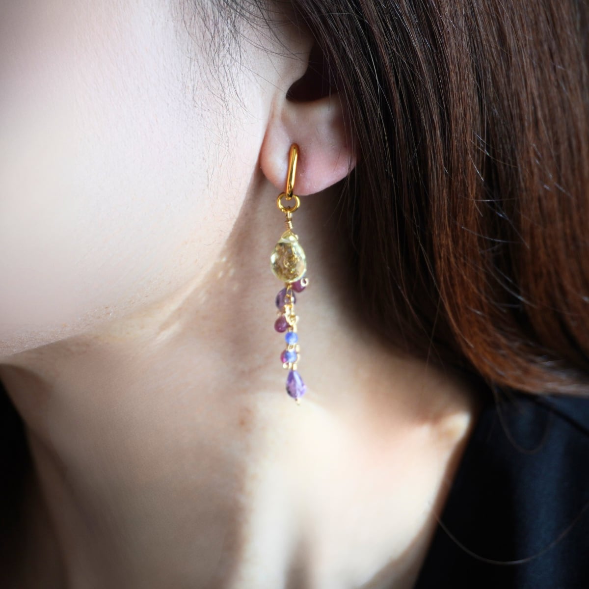 ピンク・パープルのボリュームチャームにシトリンのイエローカラーが交わり、華やかな印象に。春が待ち遠しくなるようなイヤリングチャームです。