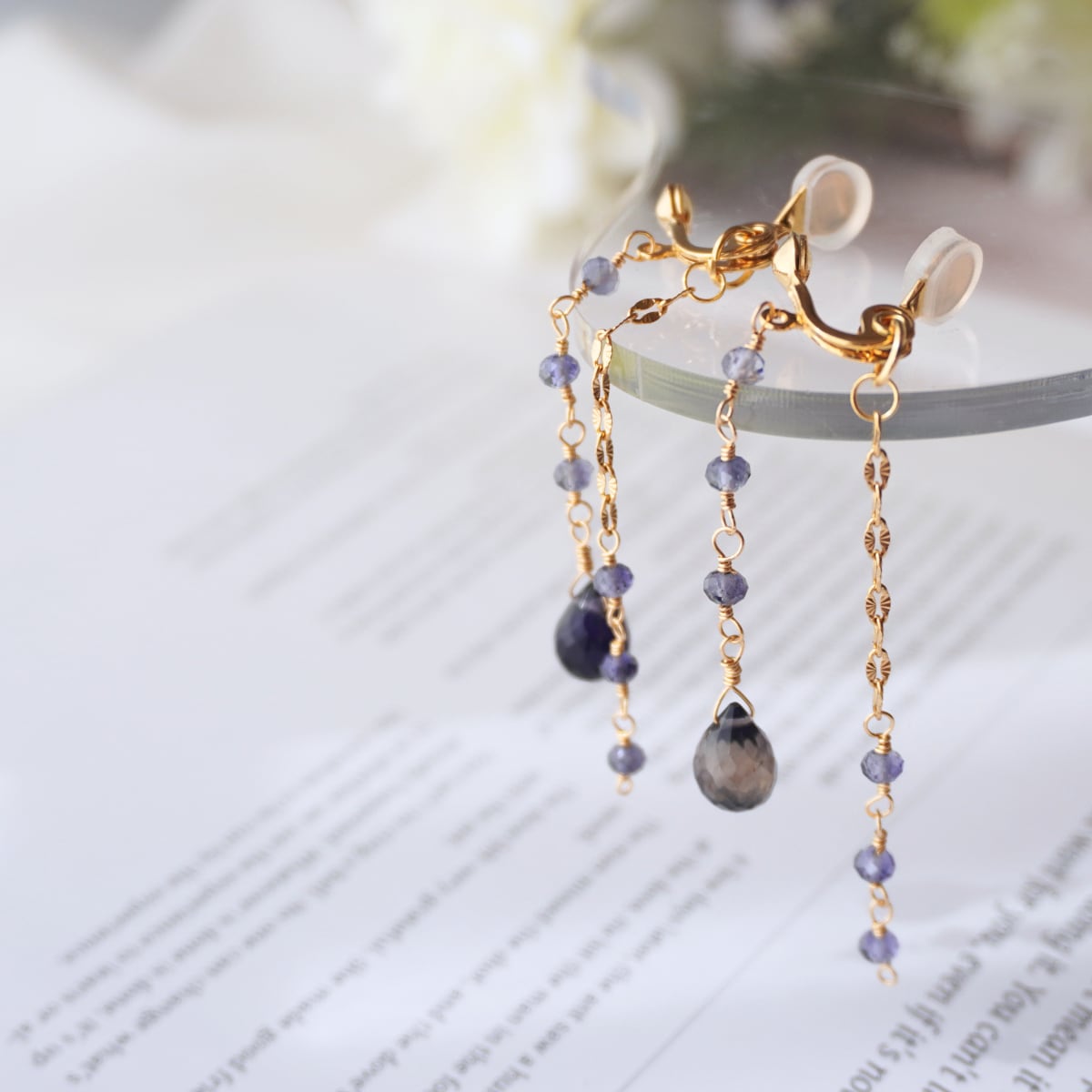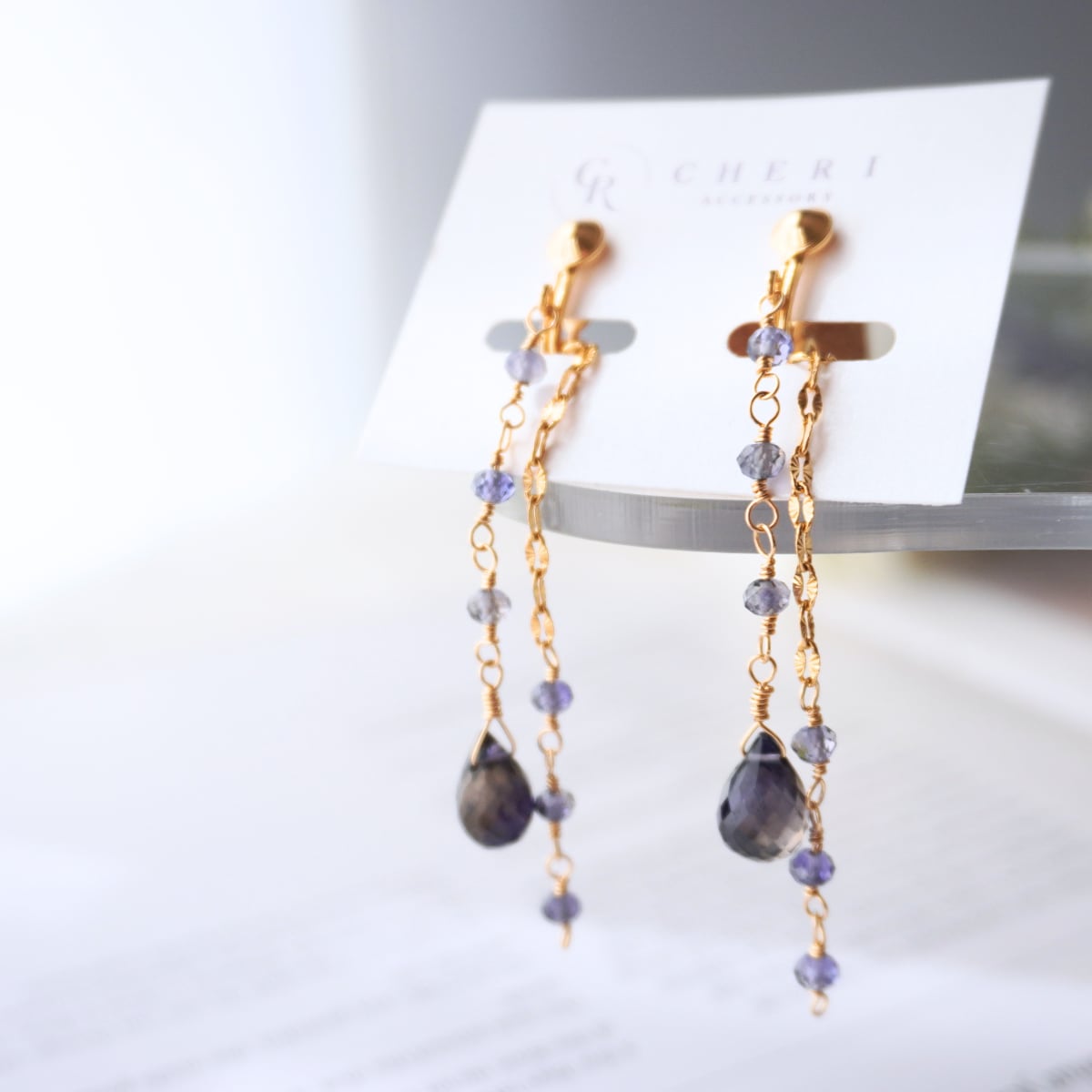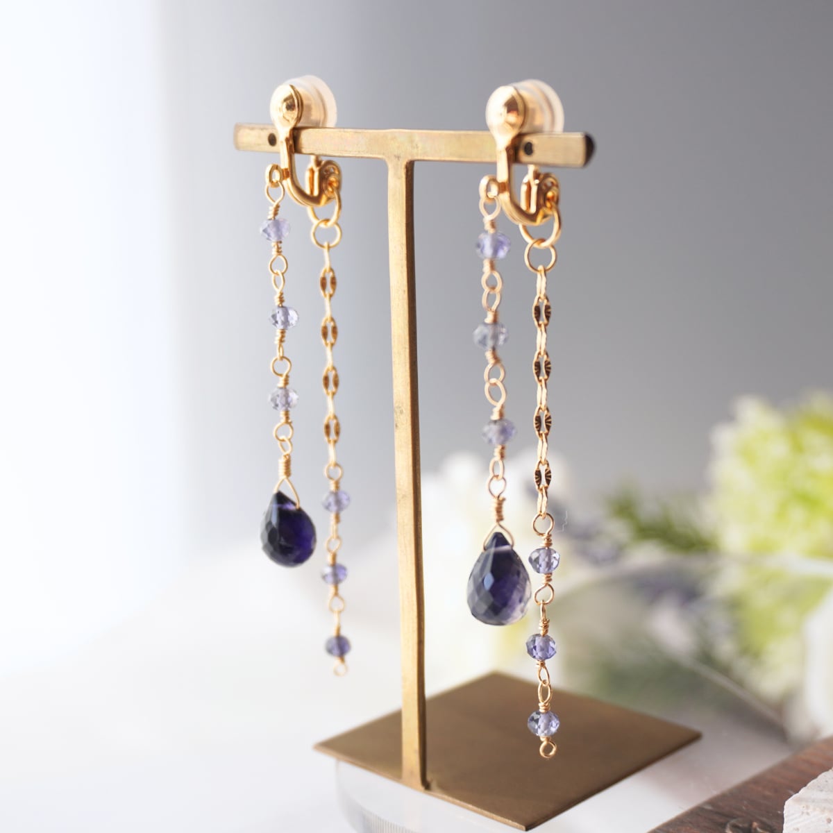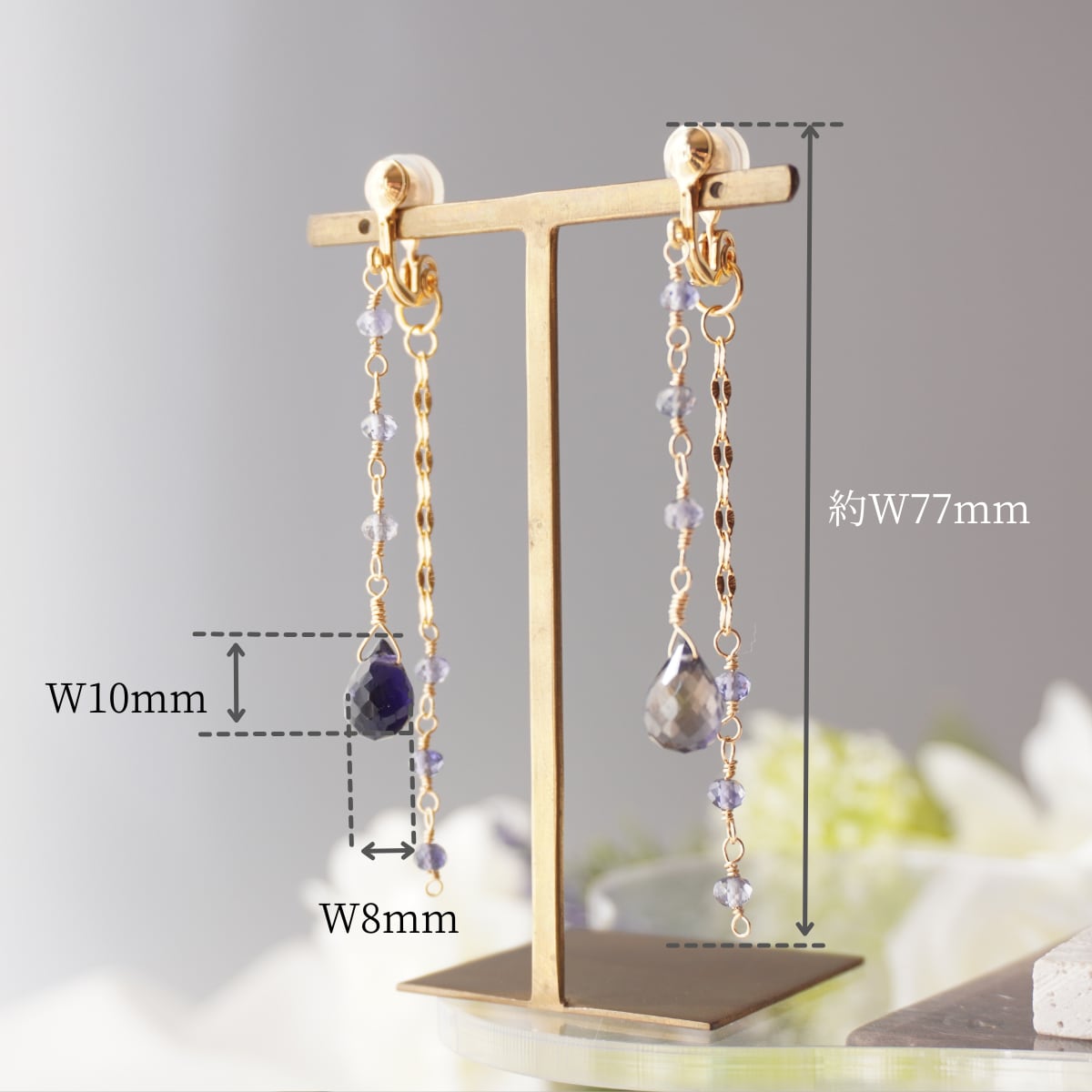 チャーム部分には、14KGFの繊細なチェーンと小粒のアイオライトを贅沢に合わせました。ワイヤーで一粒ずつ丁寧に繋いでいるため、外れる心配がなく、安心してお使いいただけます。ふとした仕草でエレガントに揺れるデザインは、大ぶりなアクセサリーがお好きな方にもご満足いただける存在感です。