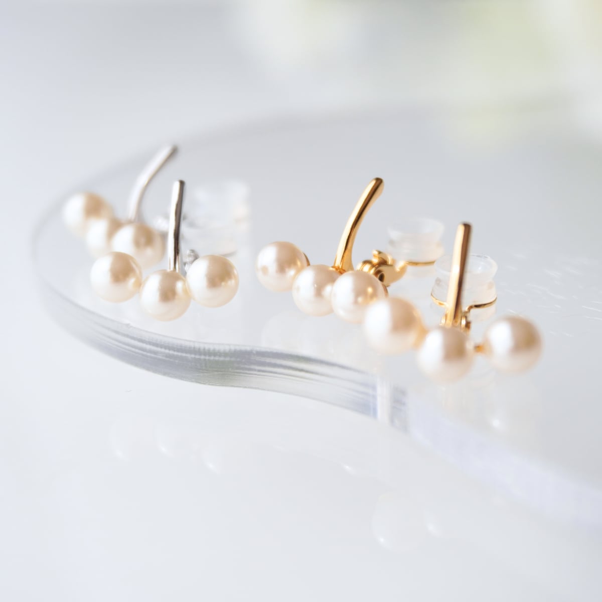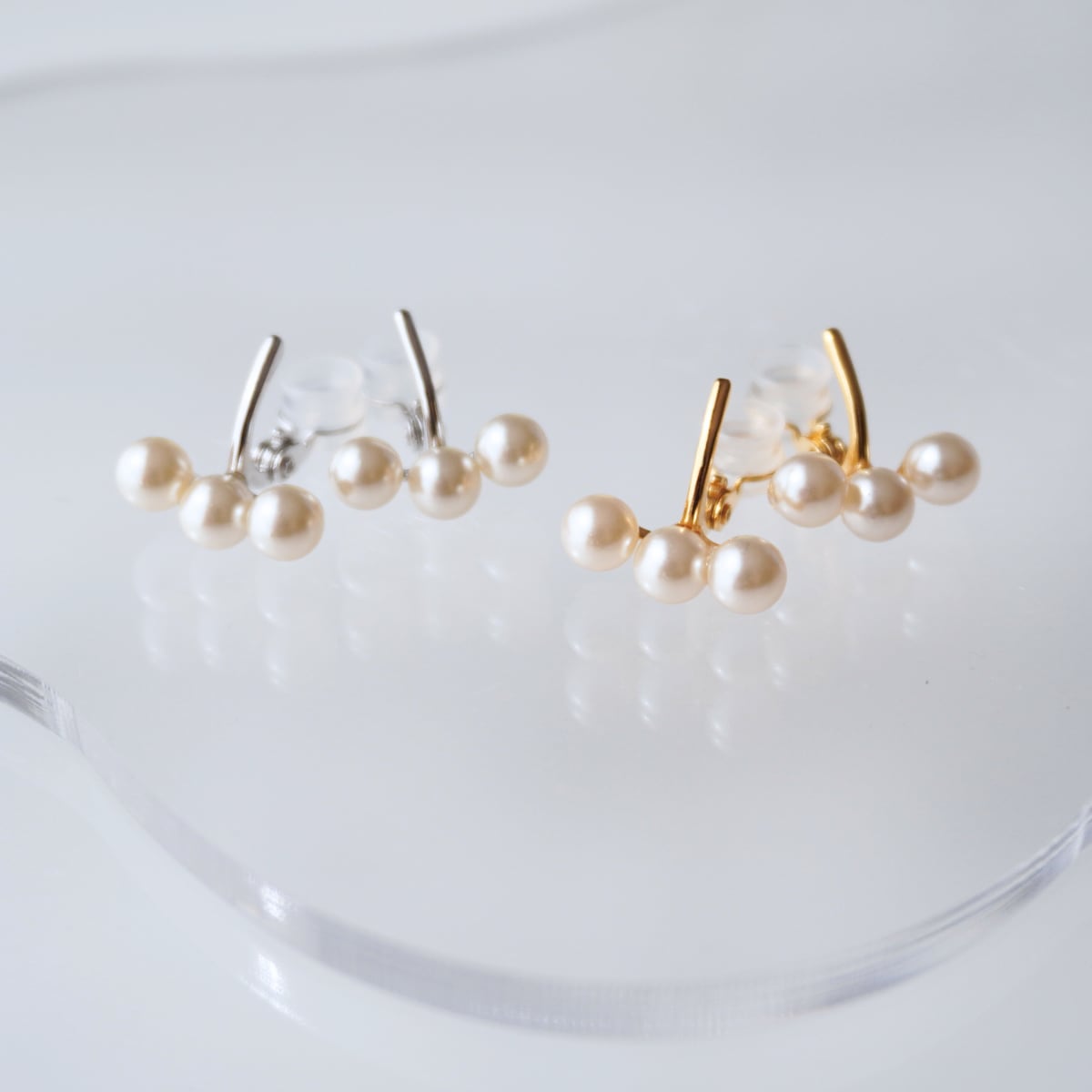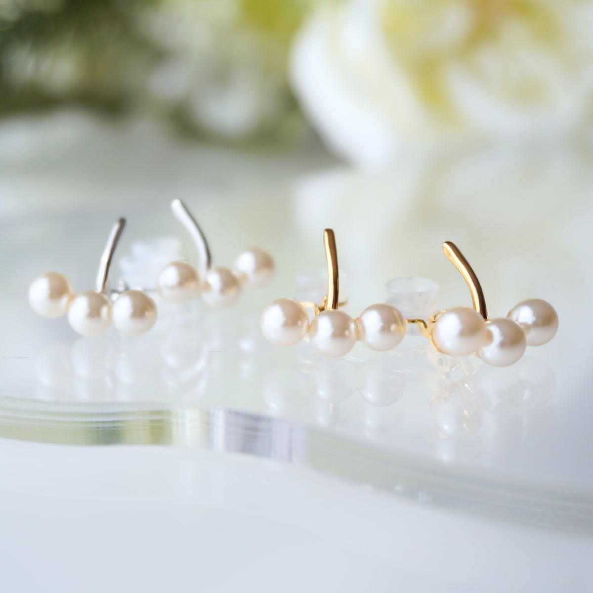 耳に沿うように配置されたパールがシンプルながら存在感があります。