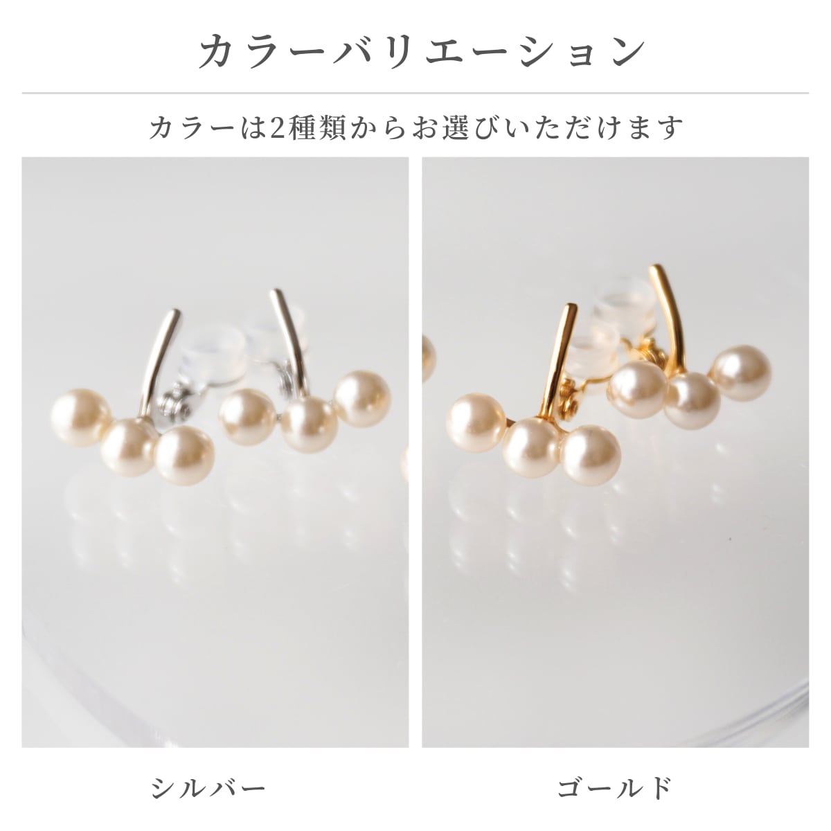 3連パールが華やかさを添える、大人女性にぴったりの上品なイヤリングです。ピアスのような見た目ながら、痛みを感じさせない設計で、長時間の着用でも快適さを保ちます。