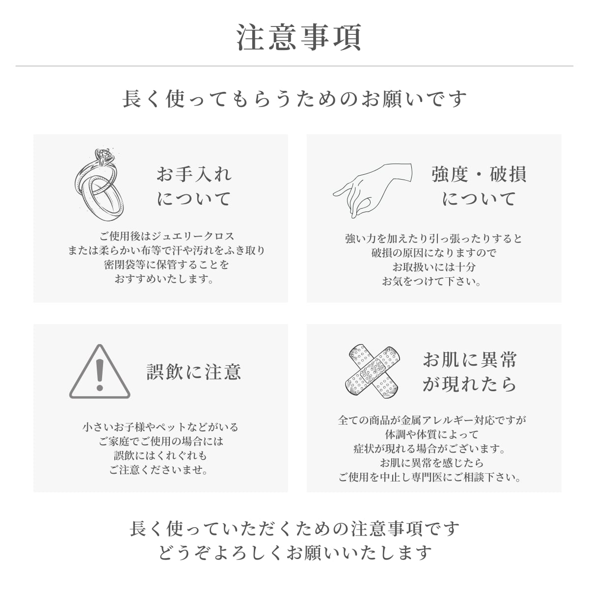 ジュエリークロス、または柔らかい布等で汗や汚れをふき取り、密閉袋等に保管することで、より長く綺麗な状態を保つことができますので、ご使用後はお手入れしていただくことをおすすめ致します。(ジュエリークロスは、サービスで同封致します)