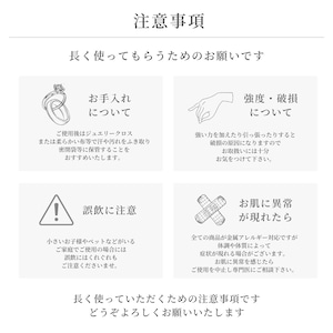 イヤリング金具はアレルギー反応を起こしにくいと言われているニッケルフリー素材のものを使用していますが個人差がある為、全ての方に必ずアレルギー反応が出ないといった証拠はありませんのでご注意くださいませ。お肌に異常が出た場合には速やかにご使用をお控え下さい。