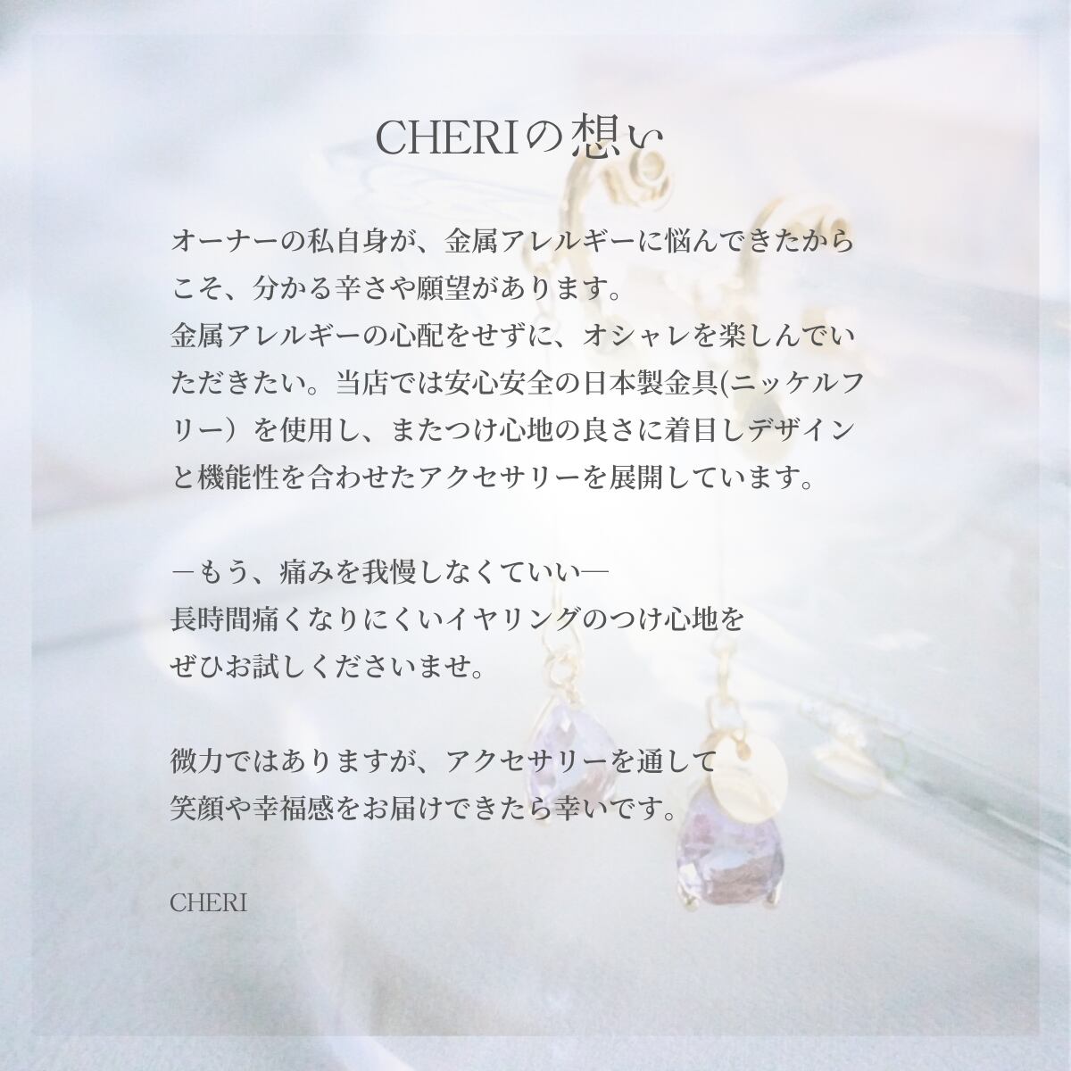 痛くてイヤリングを諦めていた、そんな悩みを持った方にもお洒落を楽しんで頂けたら嬉しいです。